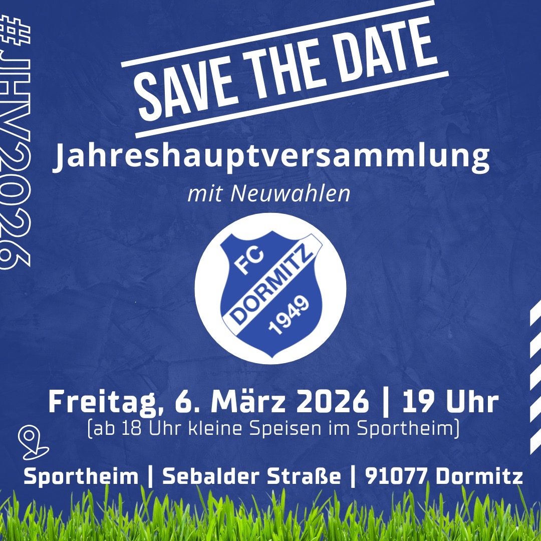 Die Jahreshauptversammlung des 1. FC Dormitz findet am Freitag, den 06.03.2026, um 19:00 Uhr, im Sportheim statt.